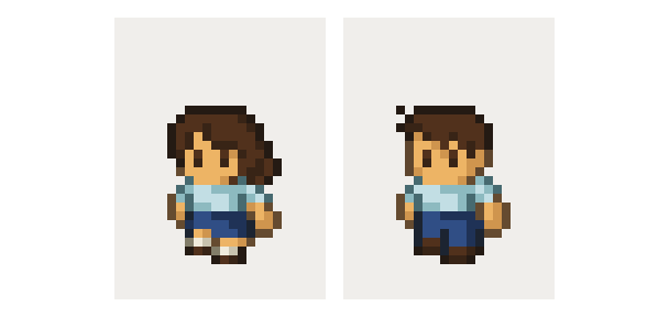 これまで、人間男女のキャラクターは16x16ドットのファミコンサイズを基準にしたものを「微妙に斜め」に見る感じでいくつか描いてきました。