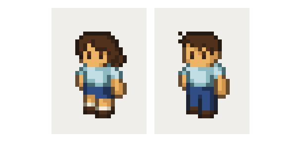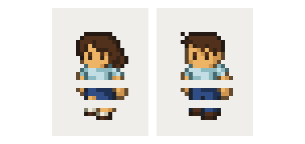 また、女性の靴が薄っぺらくてなんだか怪しい雰囲気になっているのを修正し、靴を縦2ドットにしました。子ども時代は"ソックス+靴"で2ドットしか確保できなかったのですが、今回は男子……男性にあわせることができました。